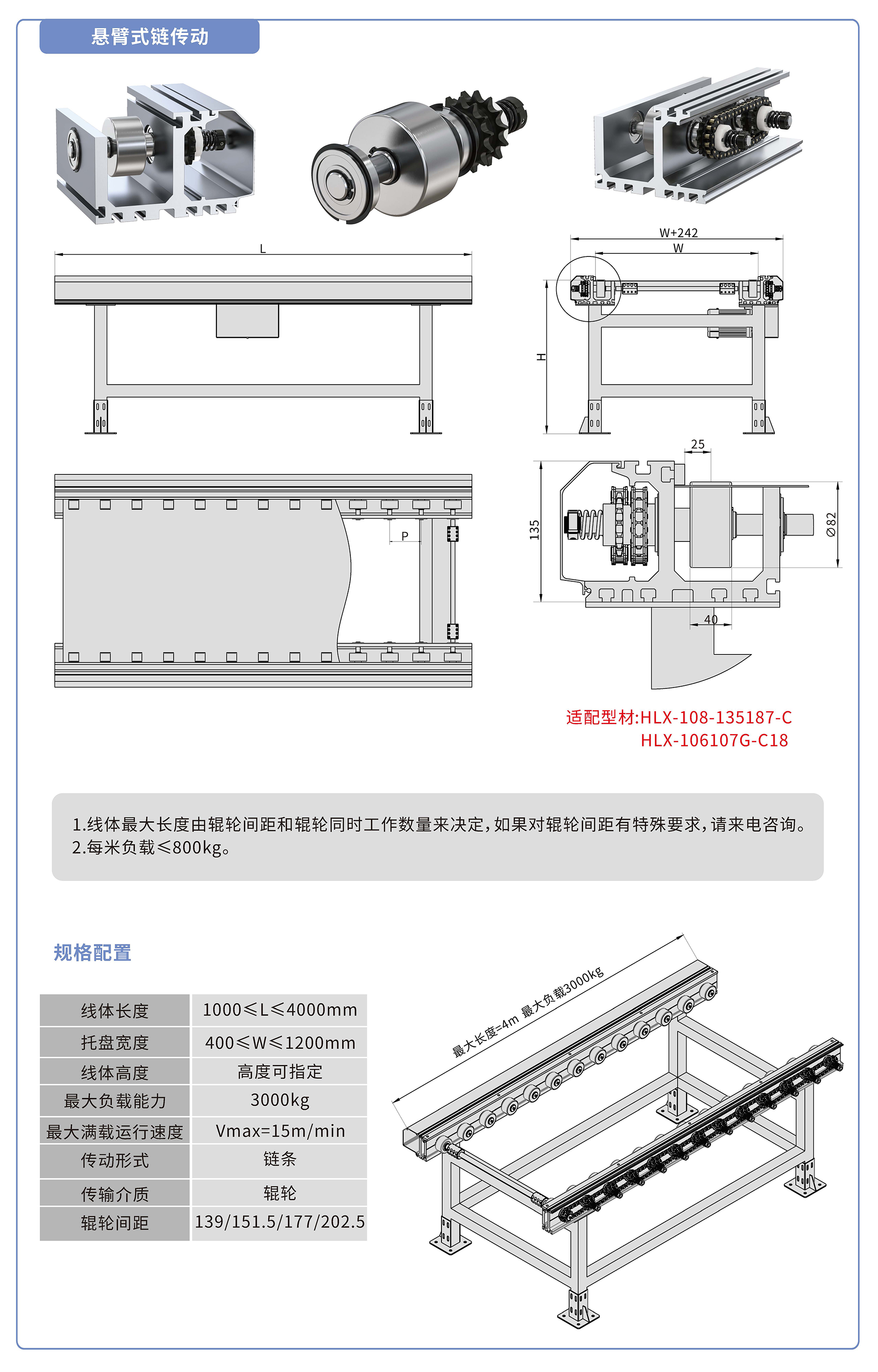 采用135187铝型材,链轮传动,镀铬滚轮镶嵌铜套实现积放功能,负载3000kg/米,最大负载速度15M/min, 轮距139、151.5、177、202.5可选,适用托盘宽度400-1200mm,线体长度范围1000-4000mm, 高度根据需求定制.